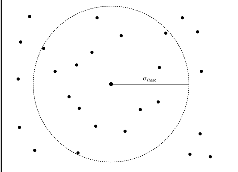 Sharing radius defines the niche size. Individuals within this radius will be regarded as being similar to eachother, needing to share fitness.